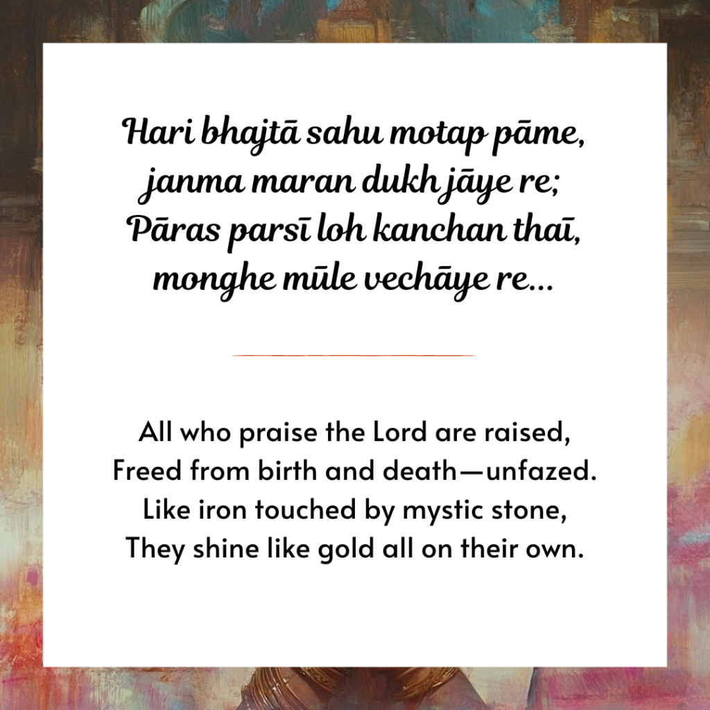 | Hari bhajta sahu motap pame, janma maran dukh jaye re; Paras parsi loh kanchan thai, monghe mule vechaye re… | All who praise the Lord are raised, Freed from birth and death-unfazed. Like iron touched by mystic stone, They shine like gold all on their own. |