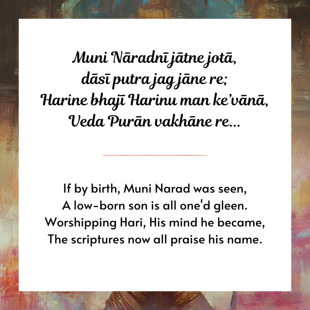 | Muni Naradni jatne jota, dasi putra jag jane re; Harine bhaì Harinu man ke’vana, Veda Puran vakhane re… | If by birth, Muni Narad was seen, A low-born son is all one’d gleen. Worshipping Hari, His mind he became, The scriptures now all praise his name. |