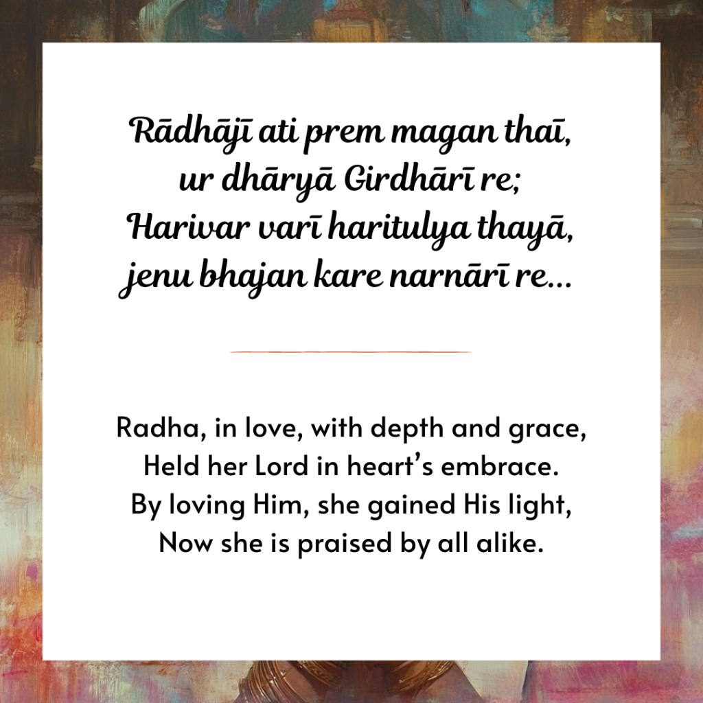 | Radhaji ati prem magan thai, ur dharya Girdhari re; Harivar vari haritulya thaya, jenu bhajan kare narnari re… | Radha, in love, with depth and grace, Held her Lord in heart’s embrace. By loving Him, she gained His light, Now she is praised by all alike. |