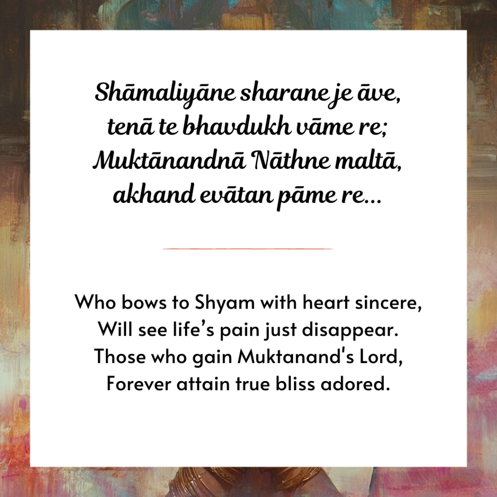 | Shamaliyane sharane je ave, tena te bhaudukh vame re; Muktanandna Nathne malta, akhand evatan pame re… | Who bows to Shyam with heart sincere, Will see life’s pain just disappear. Those who gain Muktanand’s Lord, Forever attain true bliss adored. |