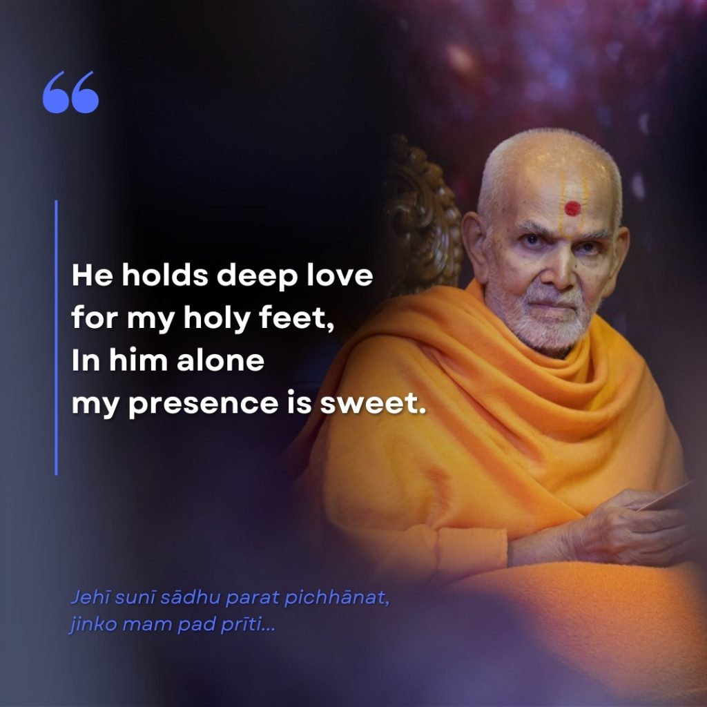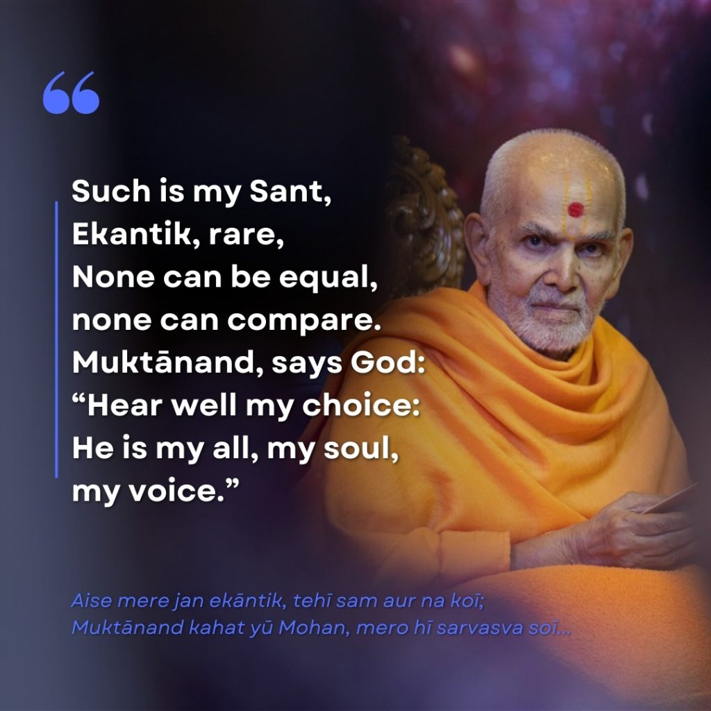 Aise mere jan ekantik, tehi sam aur na koi; Muktanand kahat yu Mohan, mero hi sarvasva soi…. | Such is my Sant, Ekantik, rare, None can be equal, none can compare. Muktanand, says God: “Hear well my choice: He is my all, my soul, my voice.” |