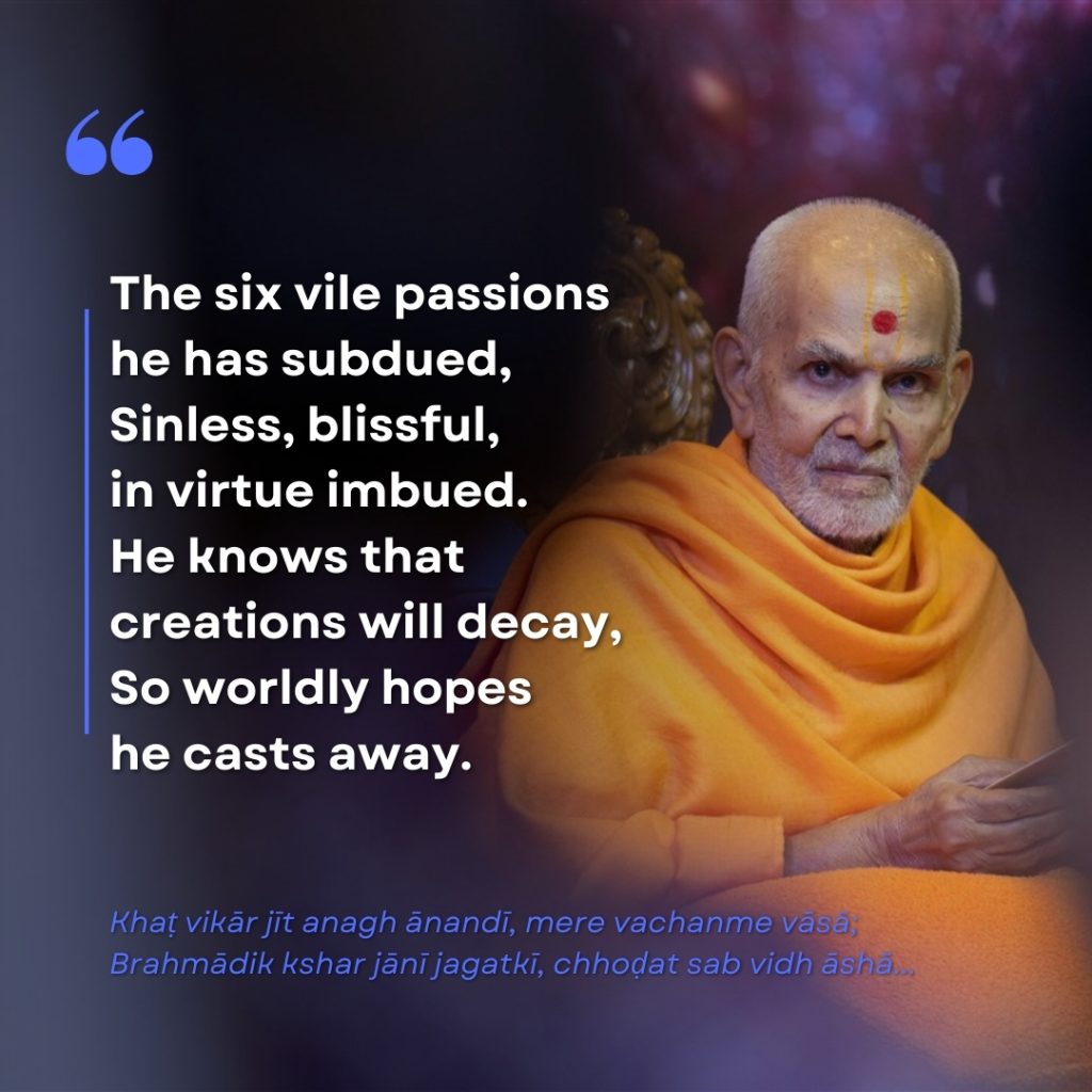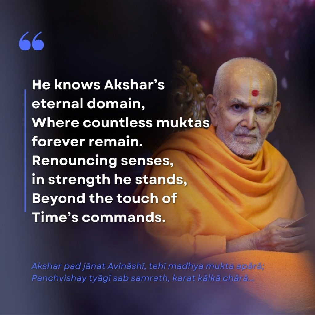 Akshar pad janat Avinashi, tehi madhya mukta apara; Panchvishay tyagi sab samrath, karat kalka chara…. | He knows Akshar’s eternal domain, Where countless muktas forever remain. Renouncing senses, in strength he stands, Beyond the touch of Time’s commands. |