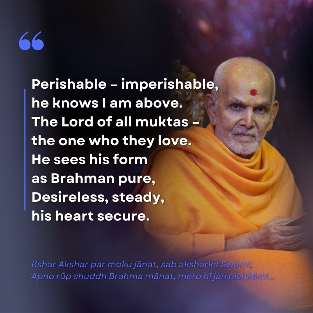 Kshar Akshar par moku janat, sab aksharko Swami; Apno rup shuddh Brahma manat, mero hi jan nishkam… | Perishable – imperishable, he knows I am above. The Lord of all muktas – the one who they love. He sees his form as Brahman pure, Desireless, steady, his heart secure. |