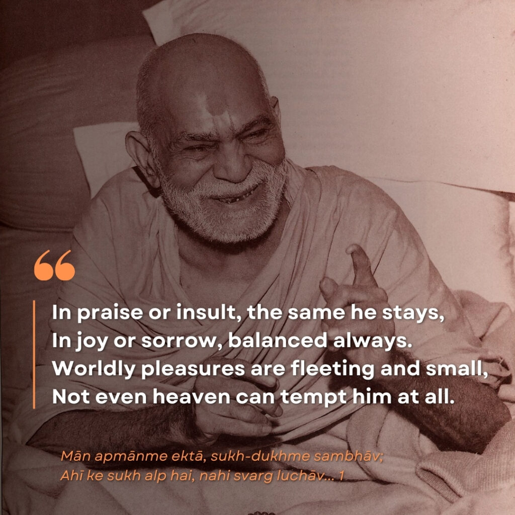 Equanimity is one of the clearest signs of spiritual maturity. Praise and insult, joy and sorrow—these pairs usually dictate our moods and reactions. But the sadhu remains steady through them all.