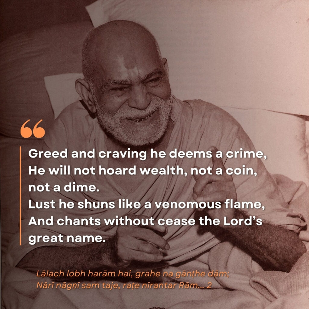 The sadhu does not merely suppress these impulses; he replaces them. Constant remembrance of Ram (God) fills the space where desire once lived. What we repeatedly think about, we slowly become.